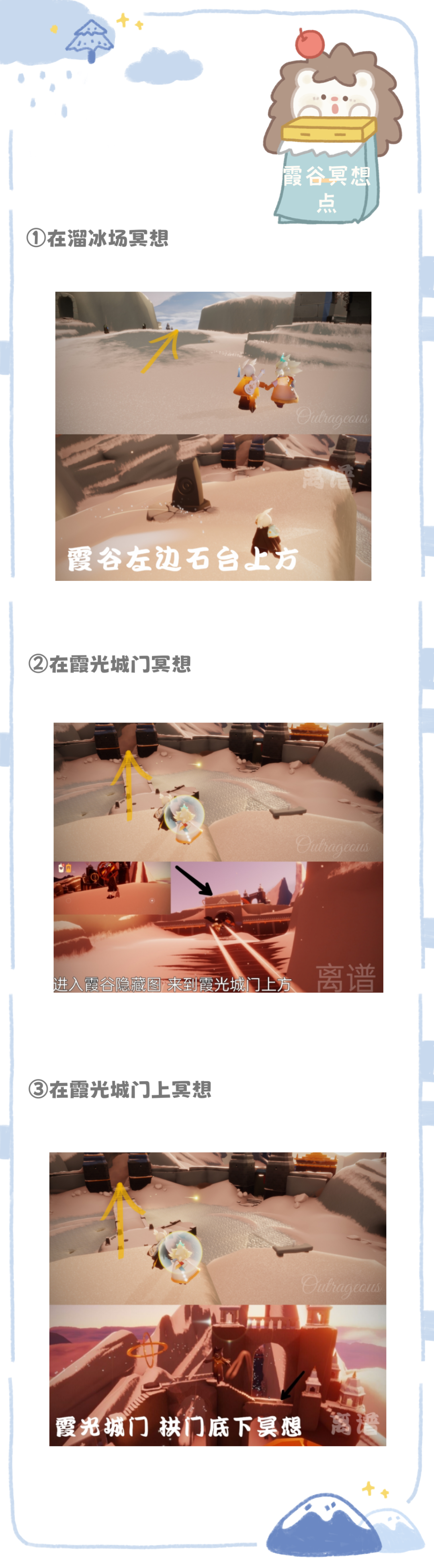 霞谷的冥想点位置有3个,第一个冥想点在霞谷的溜冰场,右侧的高台上面,第二个在霞谷的霞光城门上方,第三个在霞谷霞光城门里面,靠近出口的位置有一个拱桥,拱桥的下面就是第三个冥想点。