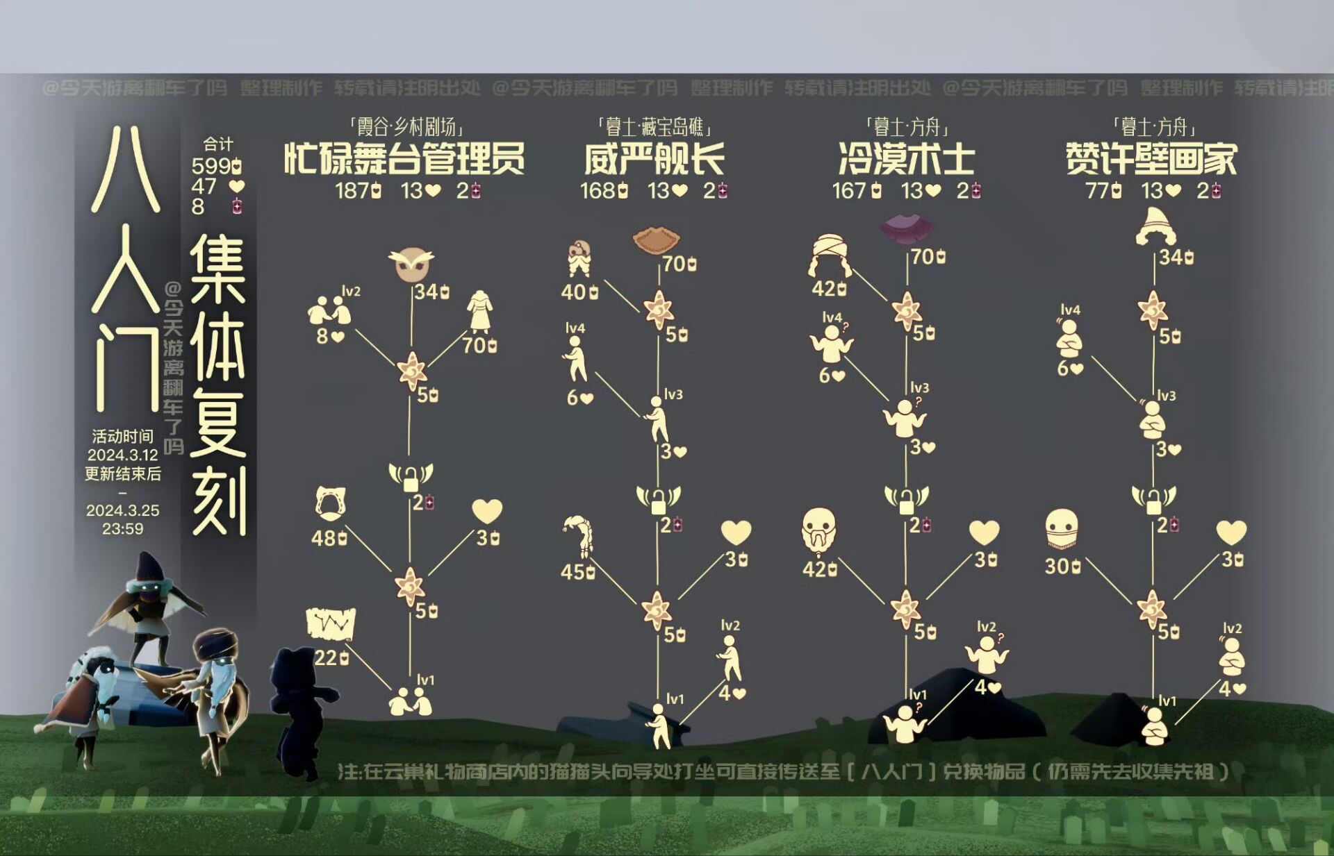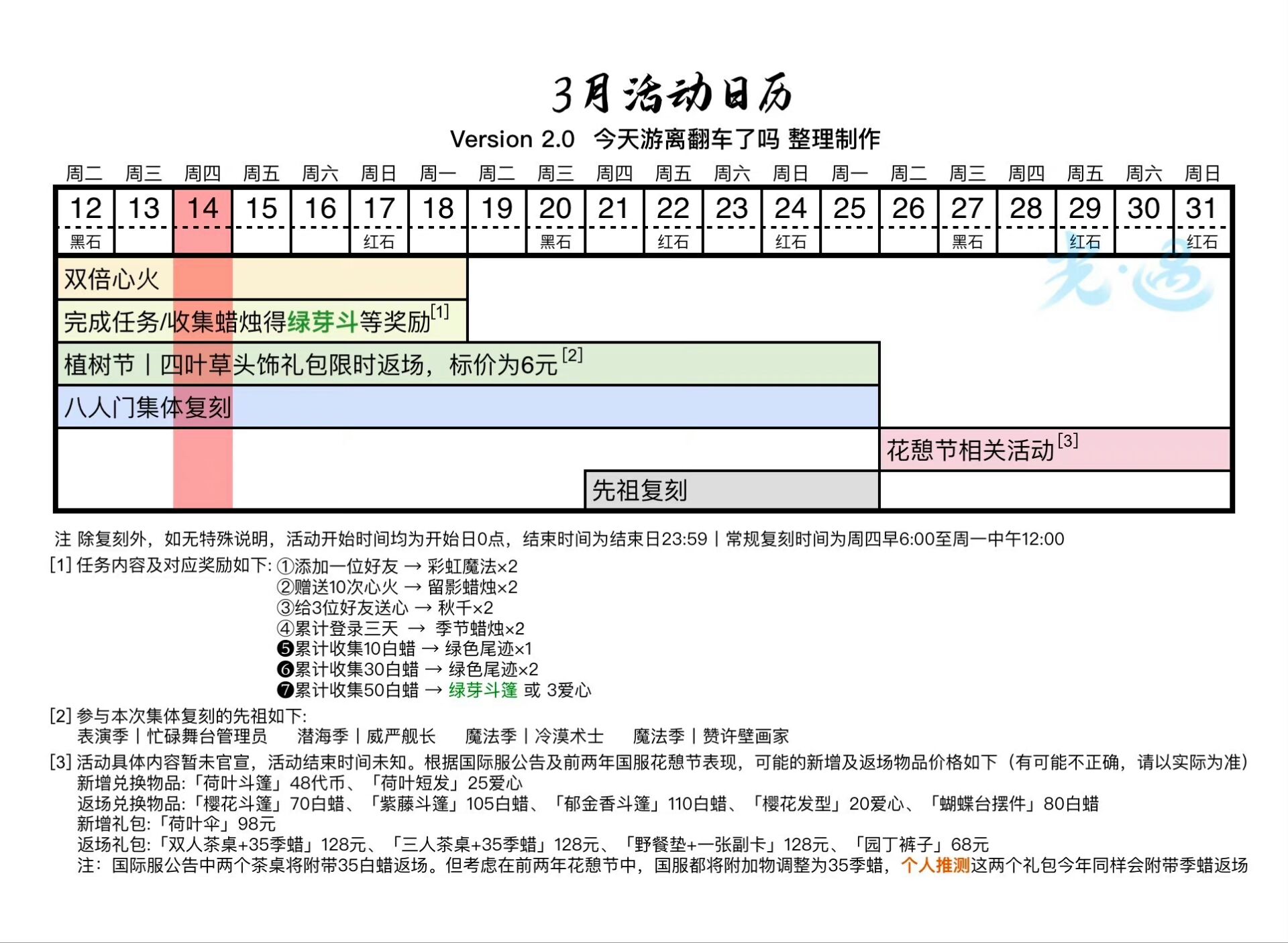 每日免费魔法[遇境商船/云巢魔法商店]: (每周四)漂浮魔法 𝟮.九色鹿季开始啦 𝟯.植树节活动进行中,四叶草发饰礼包在商城返场。3.18前收集50根白蜡可以领绿芽斗篷哦