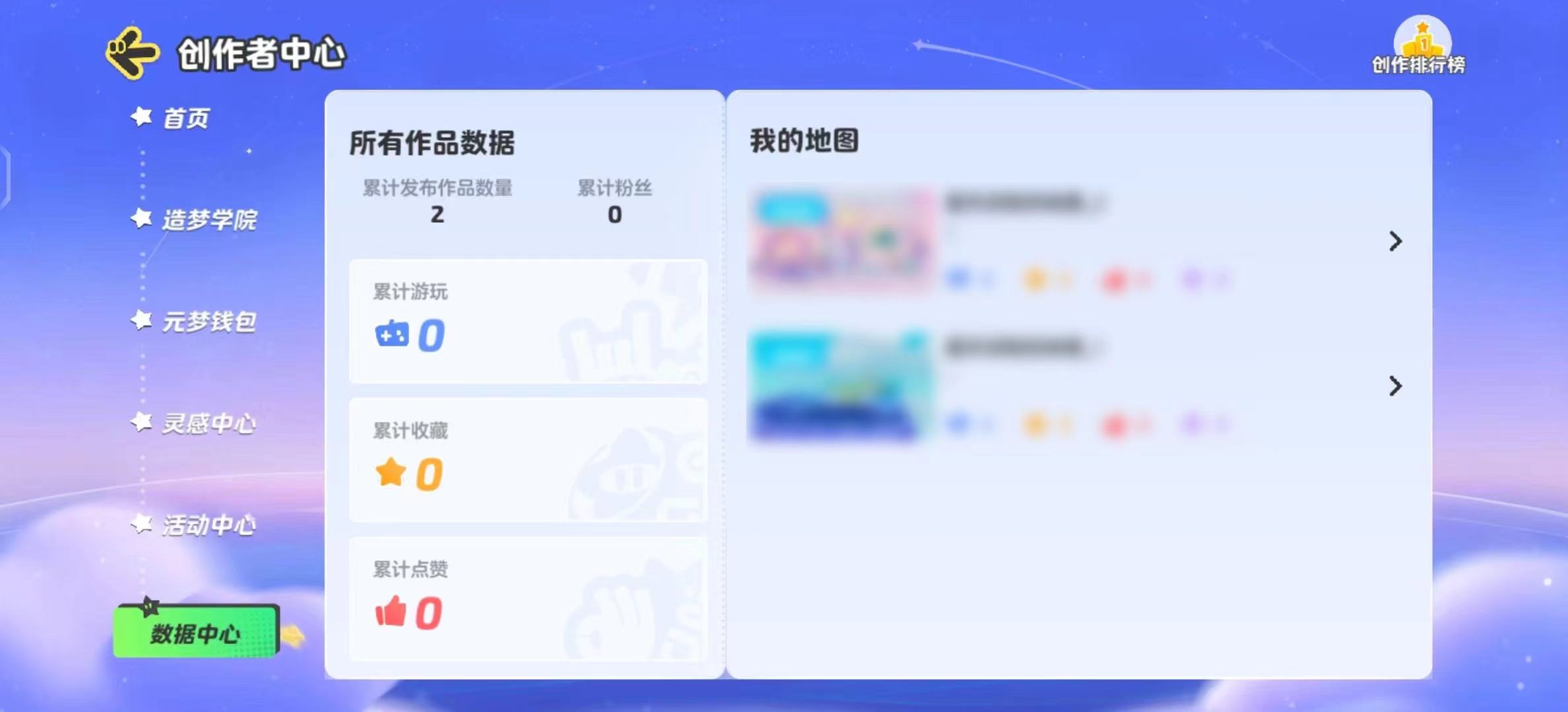 最后也是最重要的一项就是数据中心啦!在这里星宝可以看到自己所有作品的详细数据及展示,累计游玩、收藏、点赞都会一一列请,左侧的【我的地图】列表也可以一键直达具体地图,方便星宝根据数据判断地图哪里需要优化~