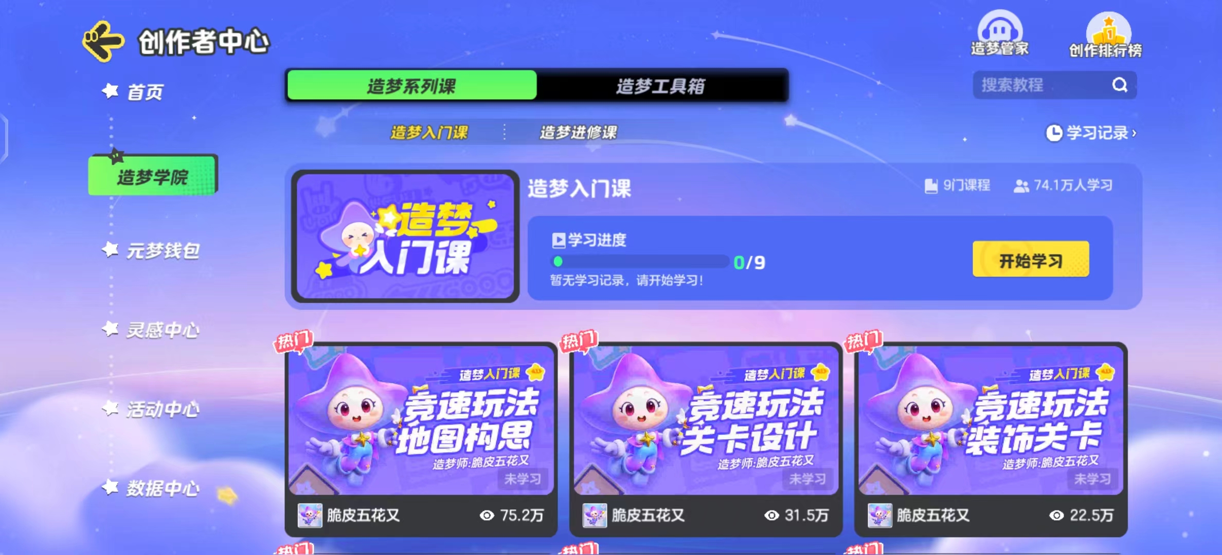 进入造梦学院后,可以看得到这里收录了造梦系列课和造梦工具箱的课程内容。