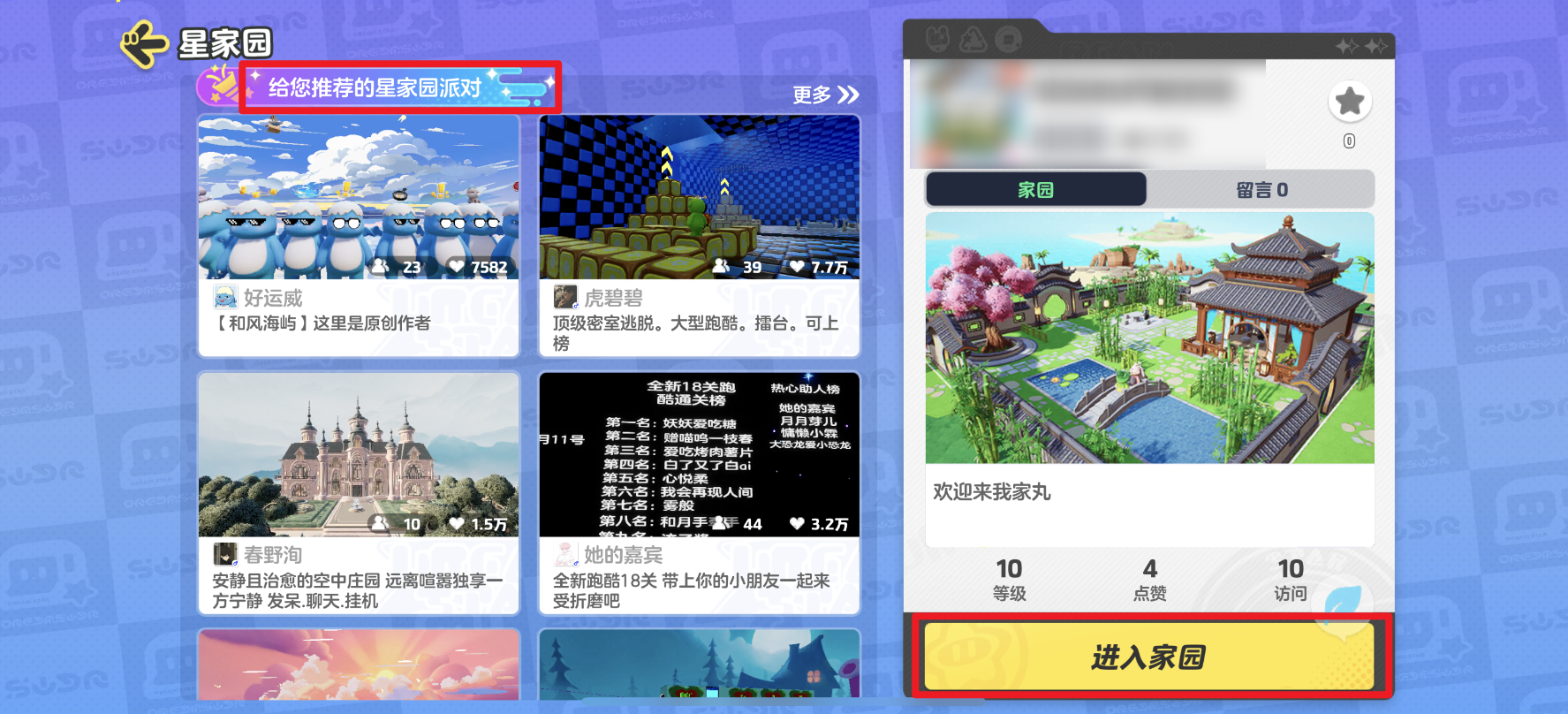 从星世界里漫游出来,是时候回星家园里歇一歇啦!进入星家园界面,这里展示着推荐的星家园派对,星宝可以选择去别人家里做客,也可以直接回到自己家中。