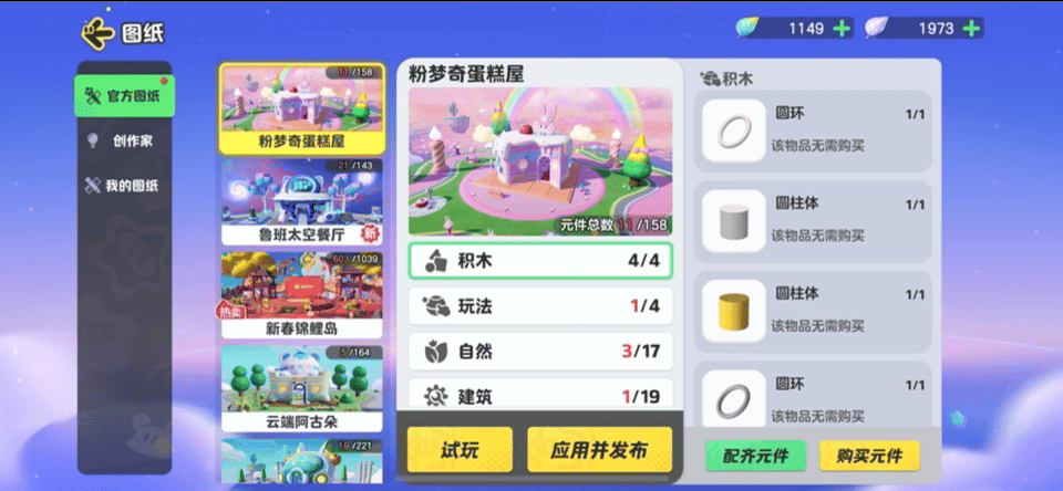 图纸里放置着包括官方图纸、创作家和我的图纸三类图纸,想要对自己的家园施工的星宝,不妨先来这里参考下其他人的图纸哦~