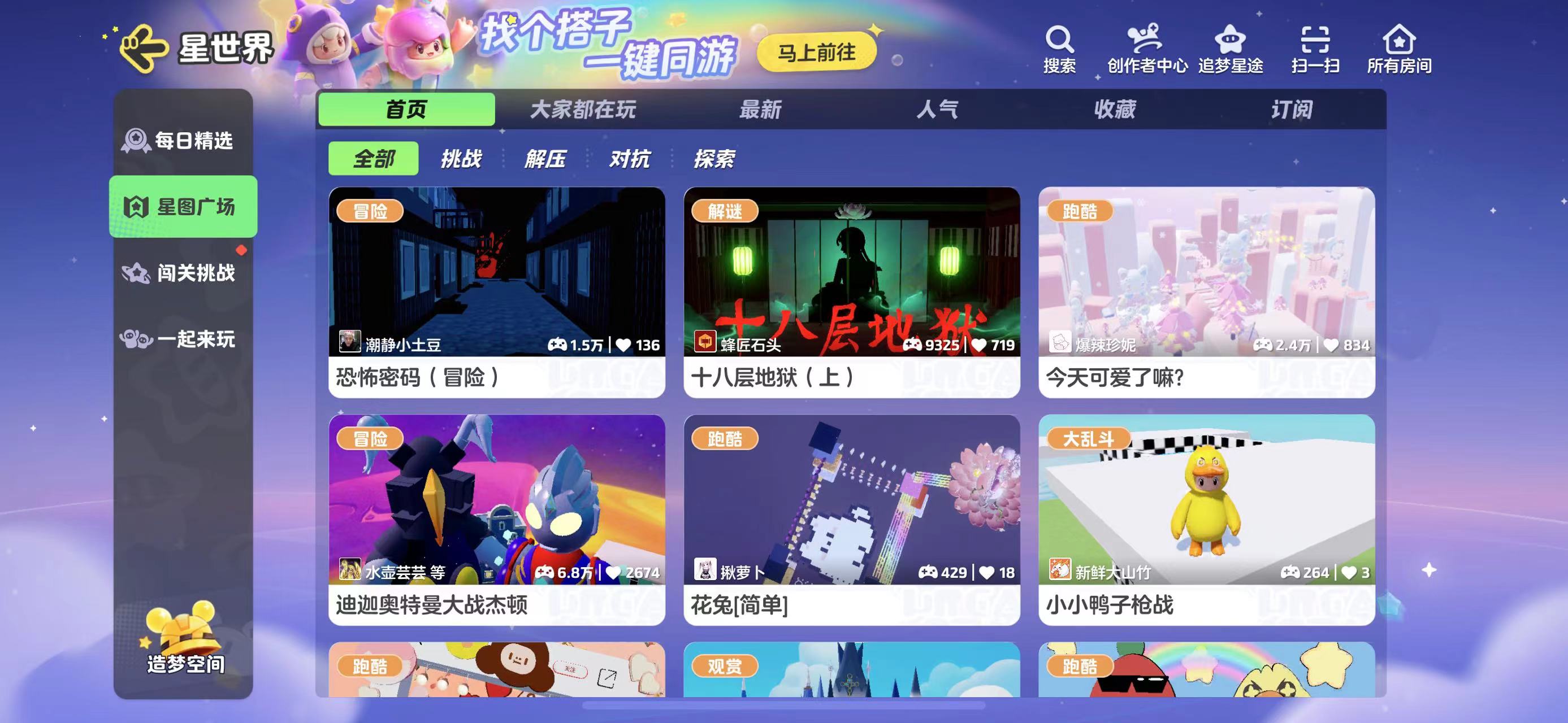 一起来玩里星宝可以匹配或创建房间,和其他玩家一起游玩多人模式的地图,星世界再也不会孤单咯!