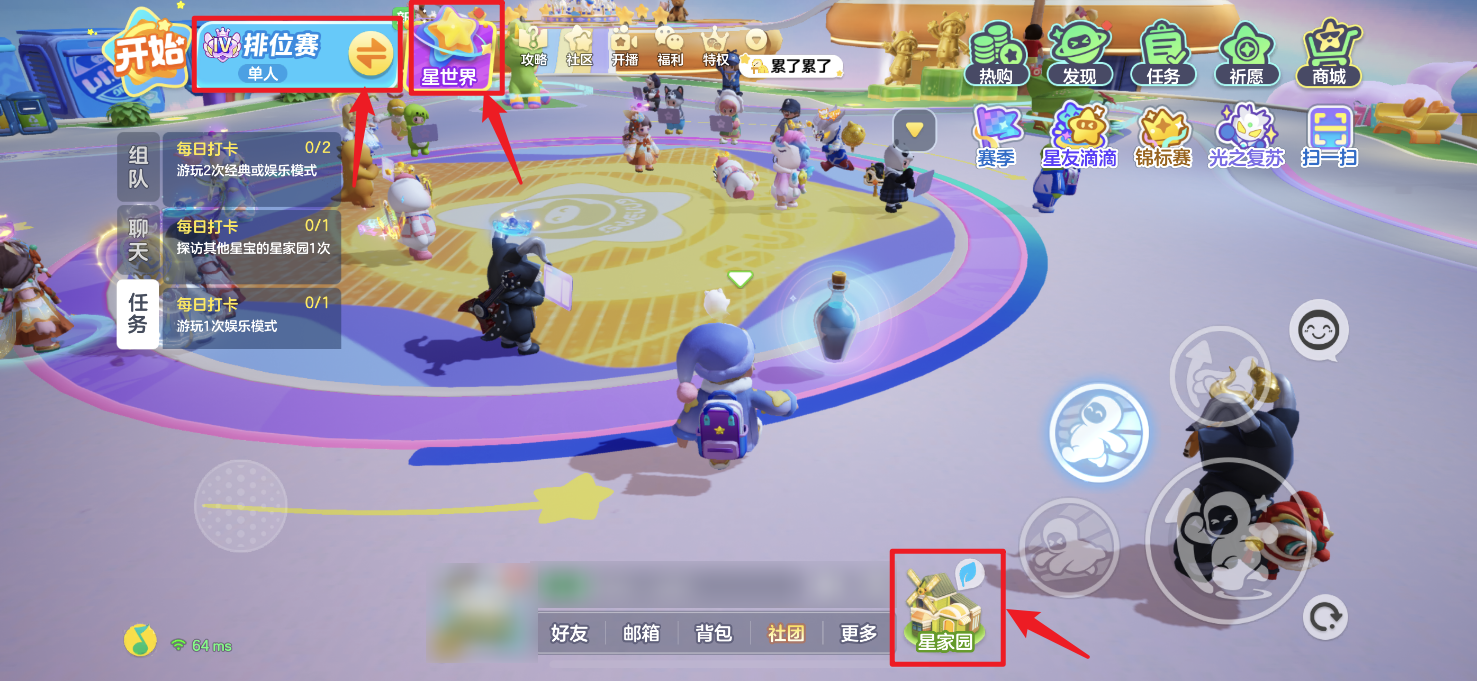 此时操作界面左上方的排位赛和星世界,分别是玩法入口和星世界入口,界面中间下方靠右还有星家园入口。