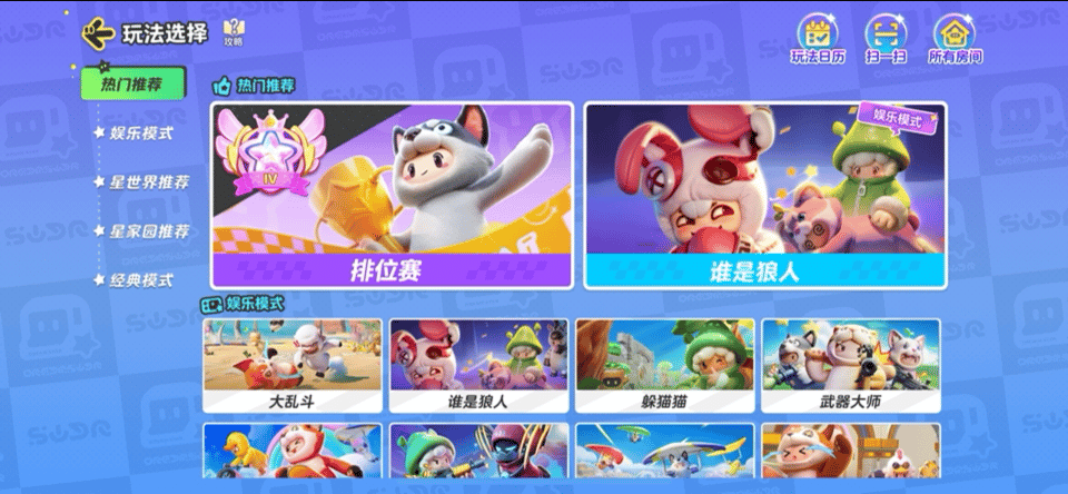 除了热门推荐里的【排位赛】和【谁是狼人】外,还有娱乐模式、星世界推荐玩法、星家园推荐玩法和【休闲赛】等足足21种玩法模式。