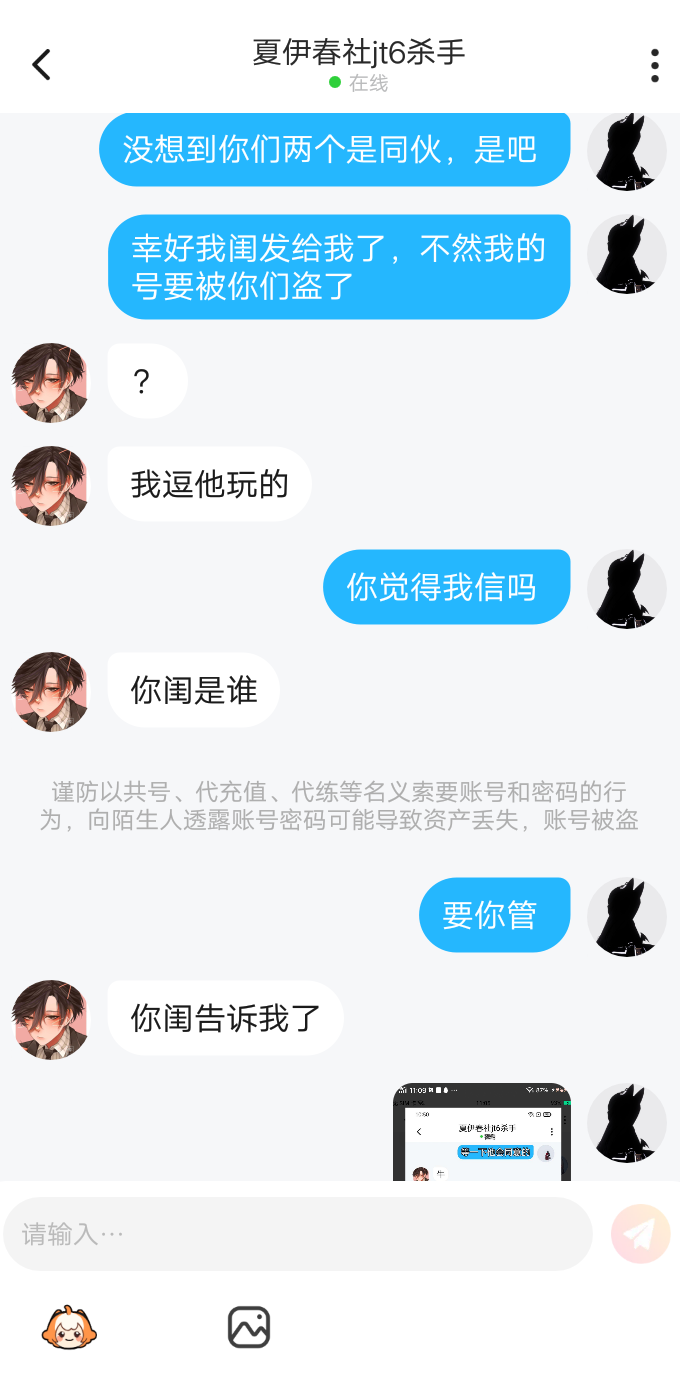 没两个觉得我是傻子吗?幸好我闺给我发了,不然我的号早就被你们盗了。而且我有两个号,我现在还正在抵防,