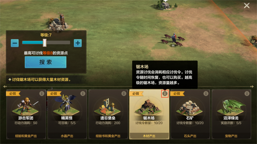 木材和矿石资源主要通过野外资源点:锯木厂和石矿产出,领主大人可以通过购买讨伐令,提升讨伐次数,并尽可能挑战高级资源点,以快速获取大量木材和矿石资源。除此之外,在英雄征程中,收复城郊资源点,也可以大幅提升资源产出效率。