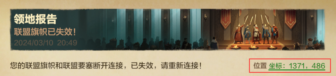 领主大人可以在联盟-领地功能中查看联盟建筑状态及位置,点击建筑坐标即可跳转查看,建筑被拆除时,联盟成员会收到带有位置信息的联盟邮件提醒,点击邮件右上角位置坐标就能找到啦。