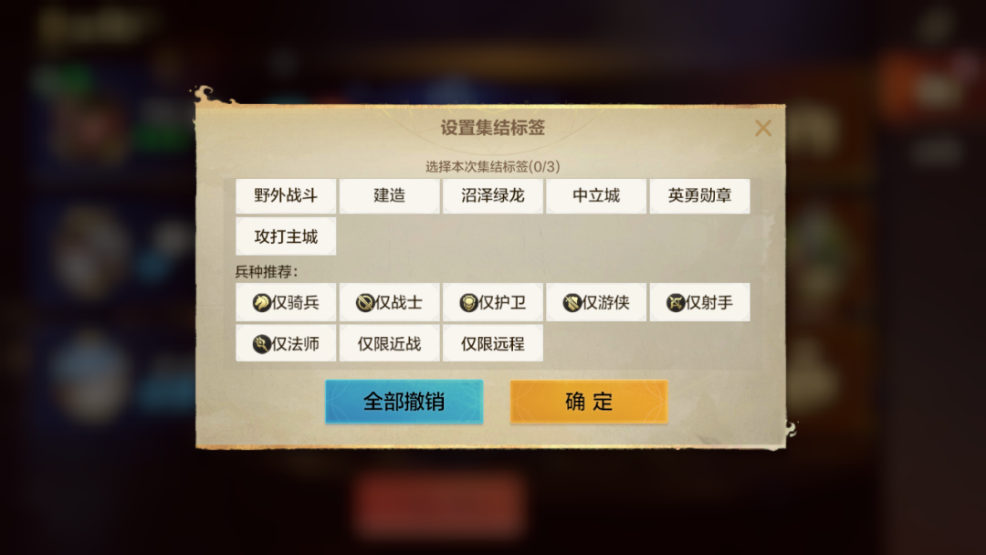 点击上图按钮,可以设置集结标签,标签中即可设置集结目标和推荐队伍兵种类型。