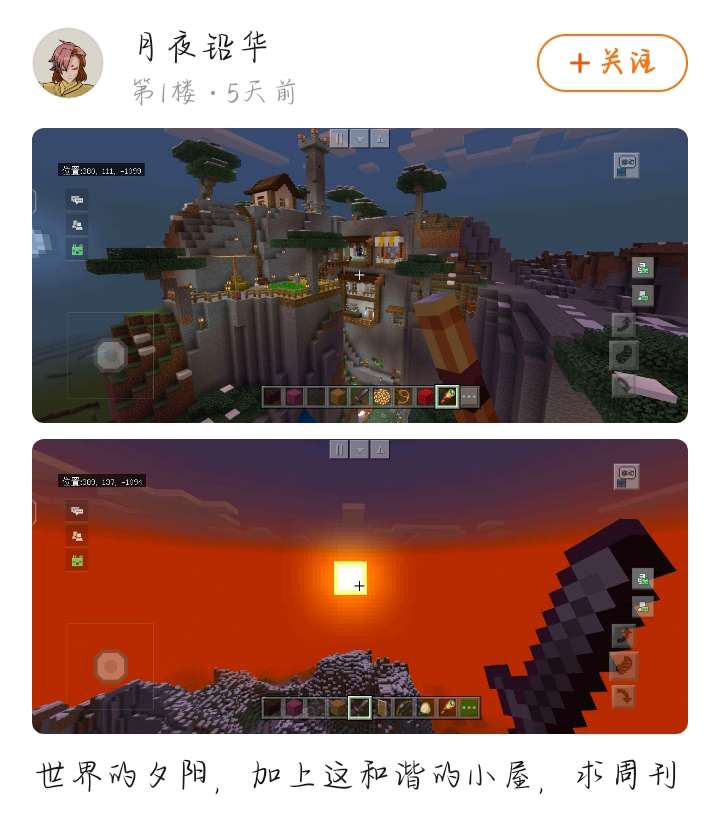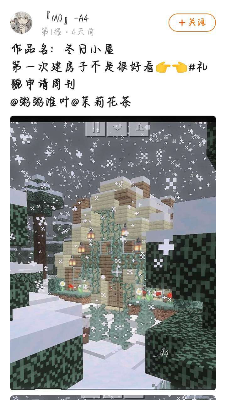 哈喽,各位MC游戏圈的小伙伴们,我是粥粥淮叶,不知不觉我们又度过了一周,不知道在上一周的你,有没有在游戏圈分享你的所见所闻呢?那么本周的周刊我收集了跟MC建筑以及绘画内容,让我们来看看这些优秀小伙伴的创作内容吧!