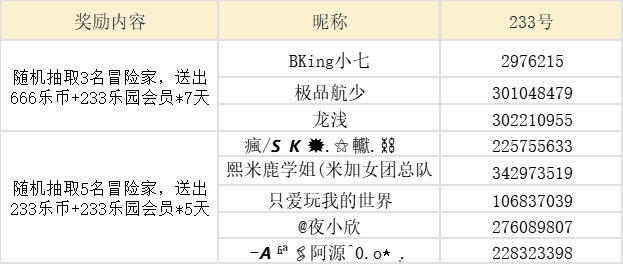 随机抽取5名冒险家,送出 233乐币+233乐园会员*5天