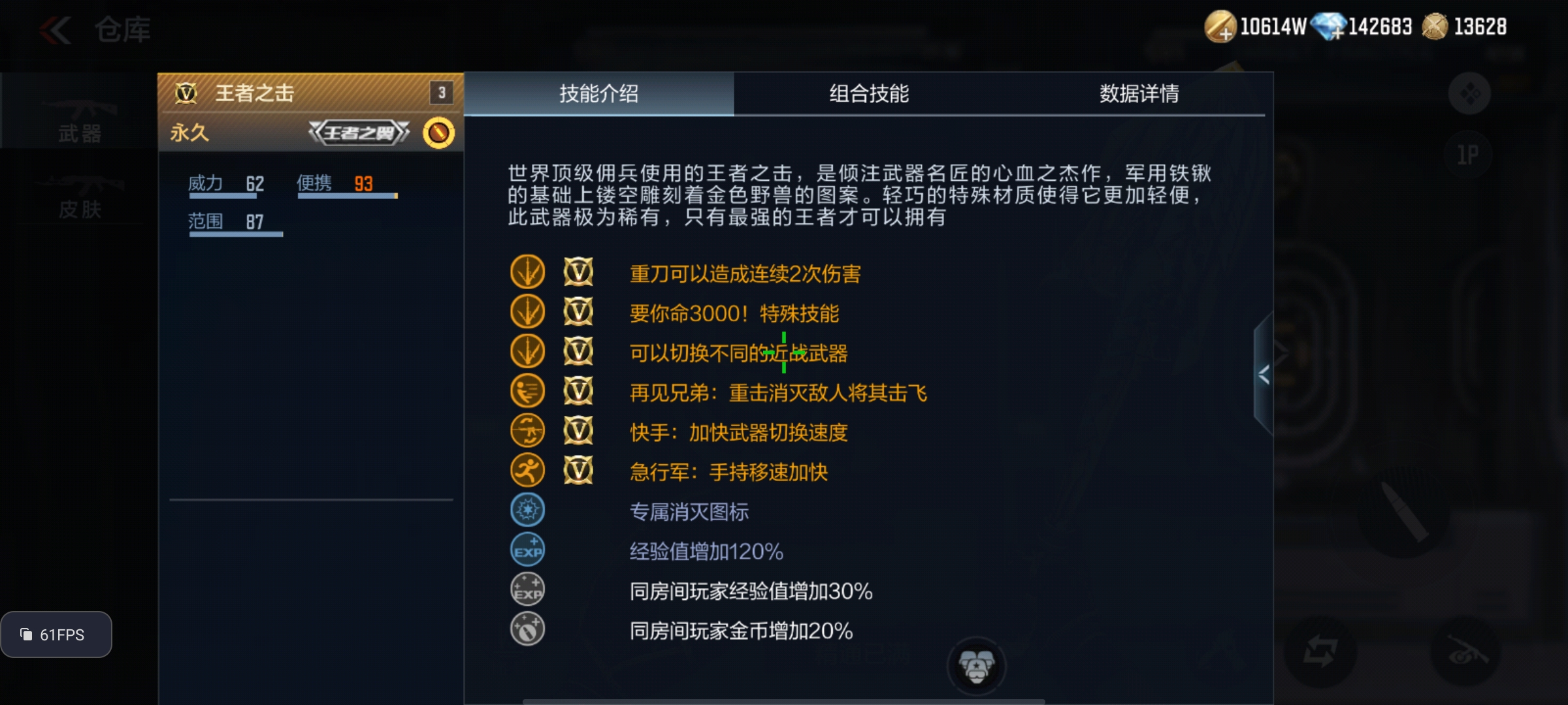 王者之击虽然是英雄级近战武器擎天的“油炸”版本,但其重击方式却在擎天的基础上全方位进行了升级。王者之击拥有独特的二段攻击,重刀可以造成连续2次伤害,搭配上王者之击优秀的重击范围和重击角度,在刀战对局中有着较高的容错率。