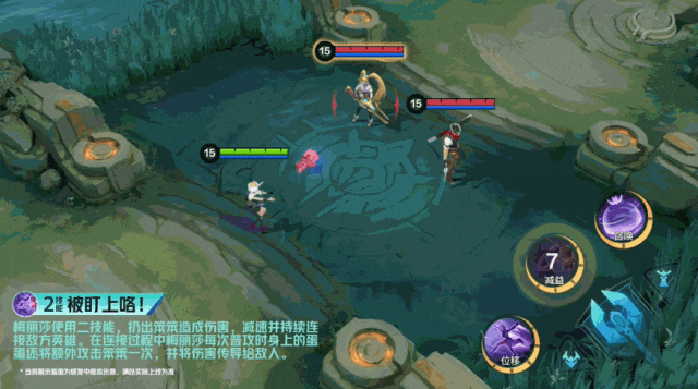梅丽莎使用二技能,扔出笨笨造成伤害,减速并持续连接敌方英雄。在连接过程中梅丽莎每次普攻时身上的蛋蛋还将额外攻击笨笨一次,并将伤害传导给敌人。