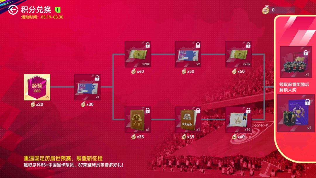 1、3月19日-3月21日期间,参与国足助威,即可领取【从新出发】队徽、50000欧元和300经纪人合同奖励。