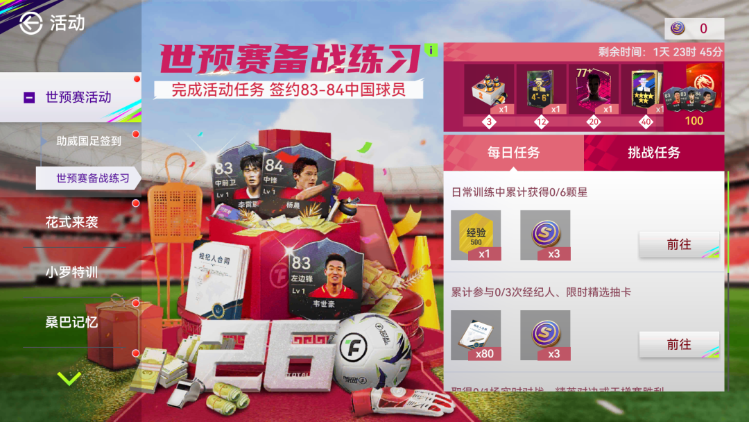 2、3月24日-3月26日期间,参与国足助威,即可领取【从新出发】队徽框、50000欧元和300经纪人合同奖励。