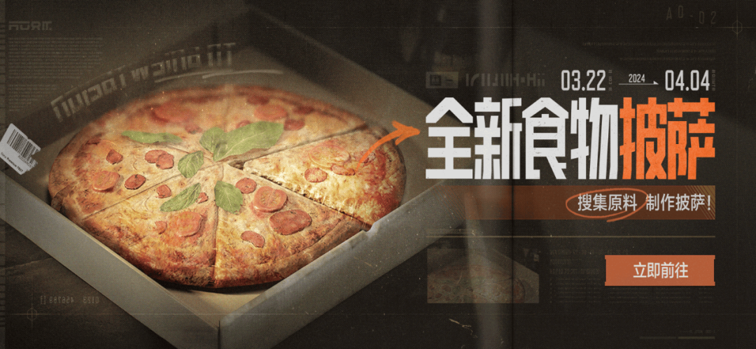 活动期间,所有地图中的防寒大衣、普通外套及蓝领工装中限时可搜刮活动食物:火腿罐头、芝士、番茄酱等原料,消耗原料可以制作特殊的限定披萨或食品;不同的组合可以制作出的披萨或食品不同,有些组合可能制作失败;原料和限定食品饮料在活动结束后将过期,请及时使用!