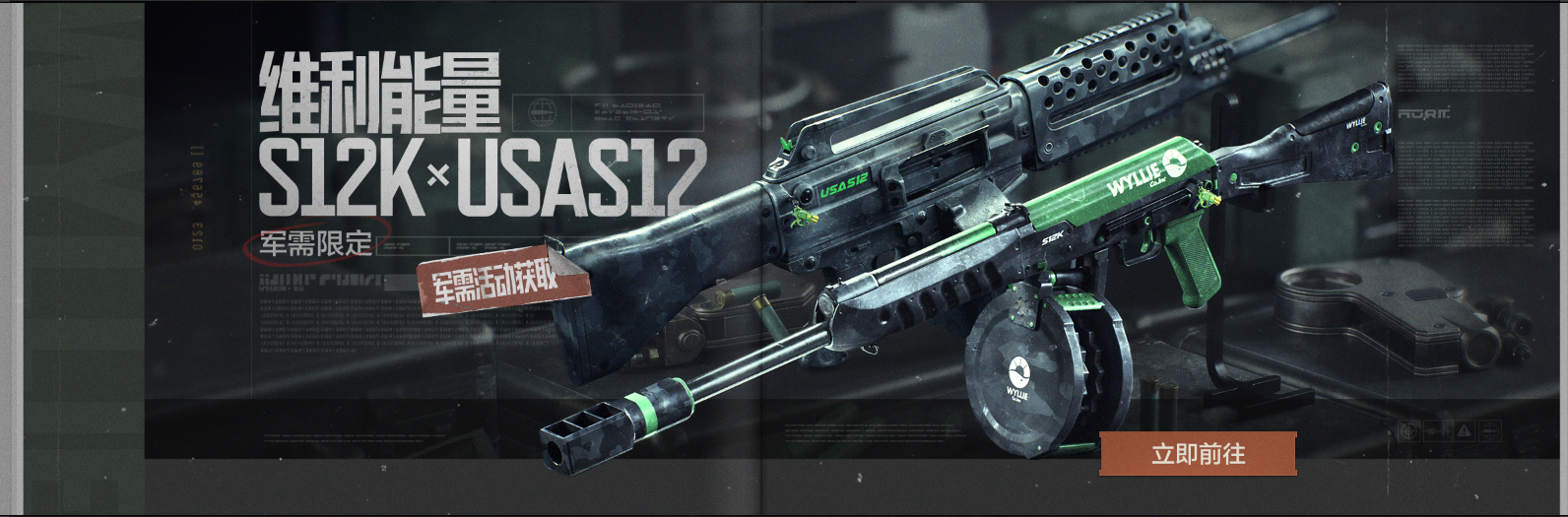 维利能量主题军需来袭!消耗军需卡有机会获取【维利能量·S12K】、【维利能量·USAS12】等限定外观奖励!