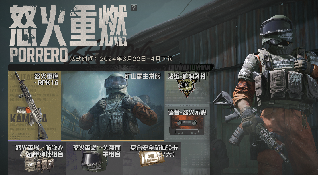 怒火重燃主题军需即将登场!博雷罗同款外观【矿山霸主常服】与怒火重燃主题枪械涂装【怒火重燃·RPK16】将在22日10:00正式上线暗区!