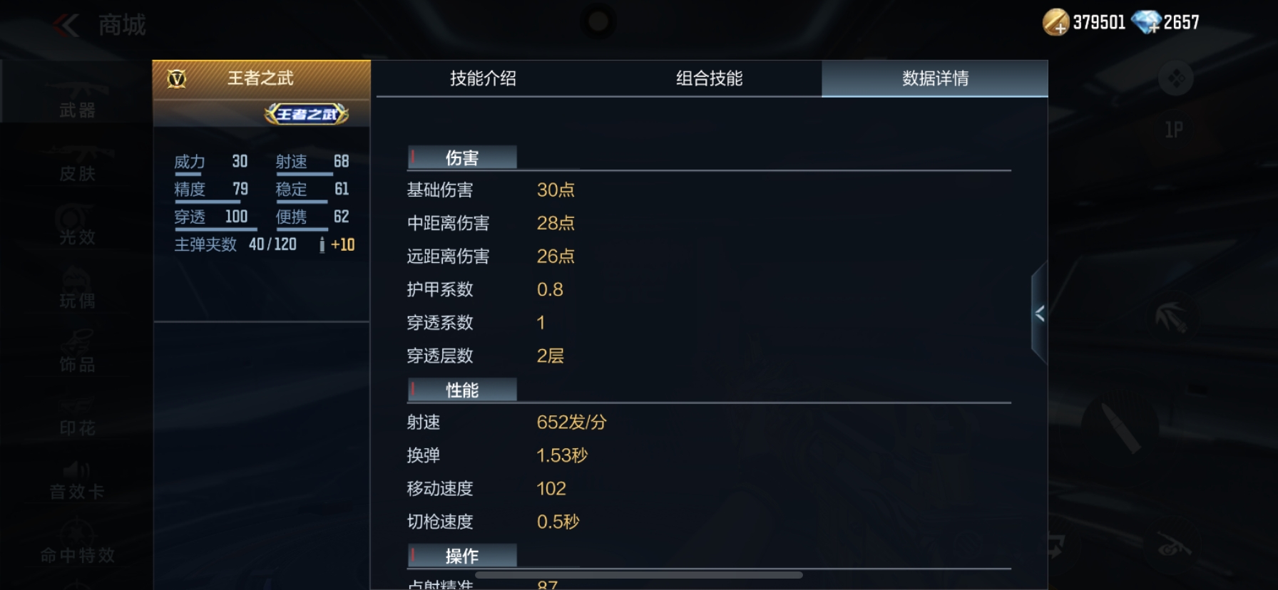 脚步声音范围降低的属性让对手难以根据脚步声精确判断你所处的位置,从而做到来无影去无踪。王者之武射击弹道更加稳定,在扫射方面能更好地控制弹道,移动扫射扩散也更小,这使得它的点射更加精准,扫射弹着点更为密集。