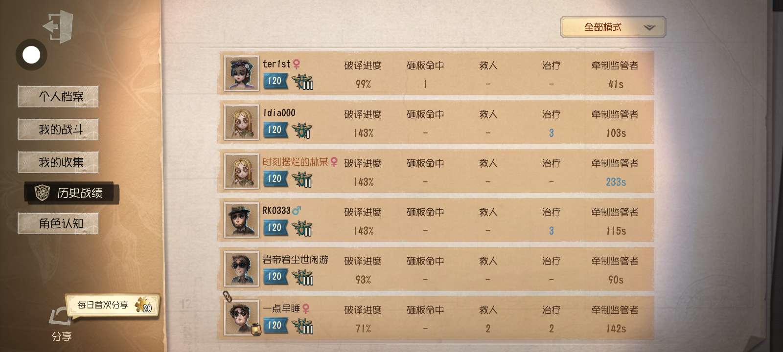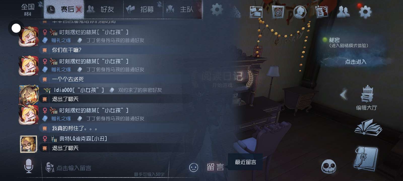 全程都是我在溜红蝶,那红蝶会玩,我差点就死她手里了,还好我翻箱子翻了个针,在他来抓我的时候,正好用上,队友不知道在干嘛,开门了,让他们发消息,快走,他们非要去救人。。。本来可以五出的。。。