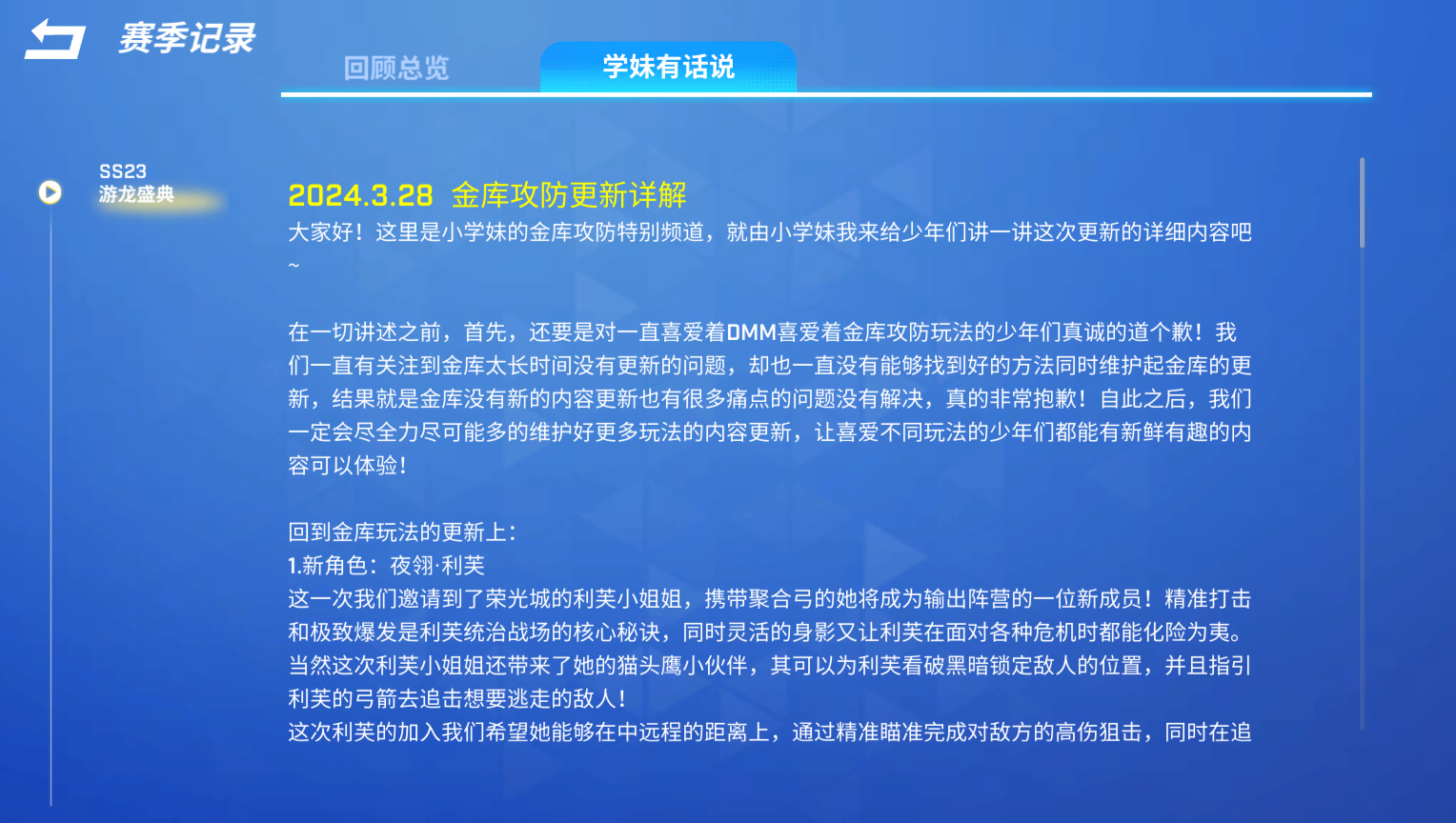 ②学妹有话说:每次更新,我们都会在【学妹有话说】特别频道,和少年们聊聊我们的更新思路以及未来的规划情况!也欢迎少年们多多反馈呦,一起共创更好的体验吧~