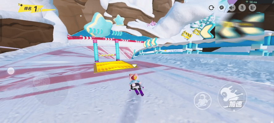 开局倒计时结束,星宝们进入雪地赛道,首先会遇到一段小斜坡和两条加速带。加速带可以迅速拉开和其他星宝们的距离,斜坡腾空也能增加移速,星宝们自由选择就好啦~