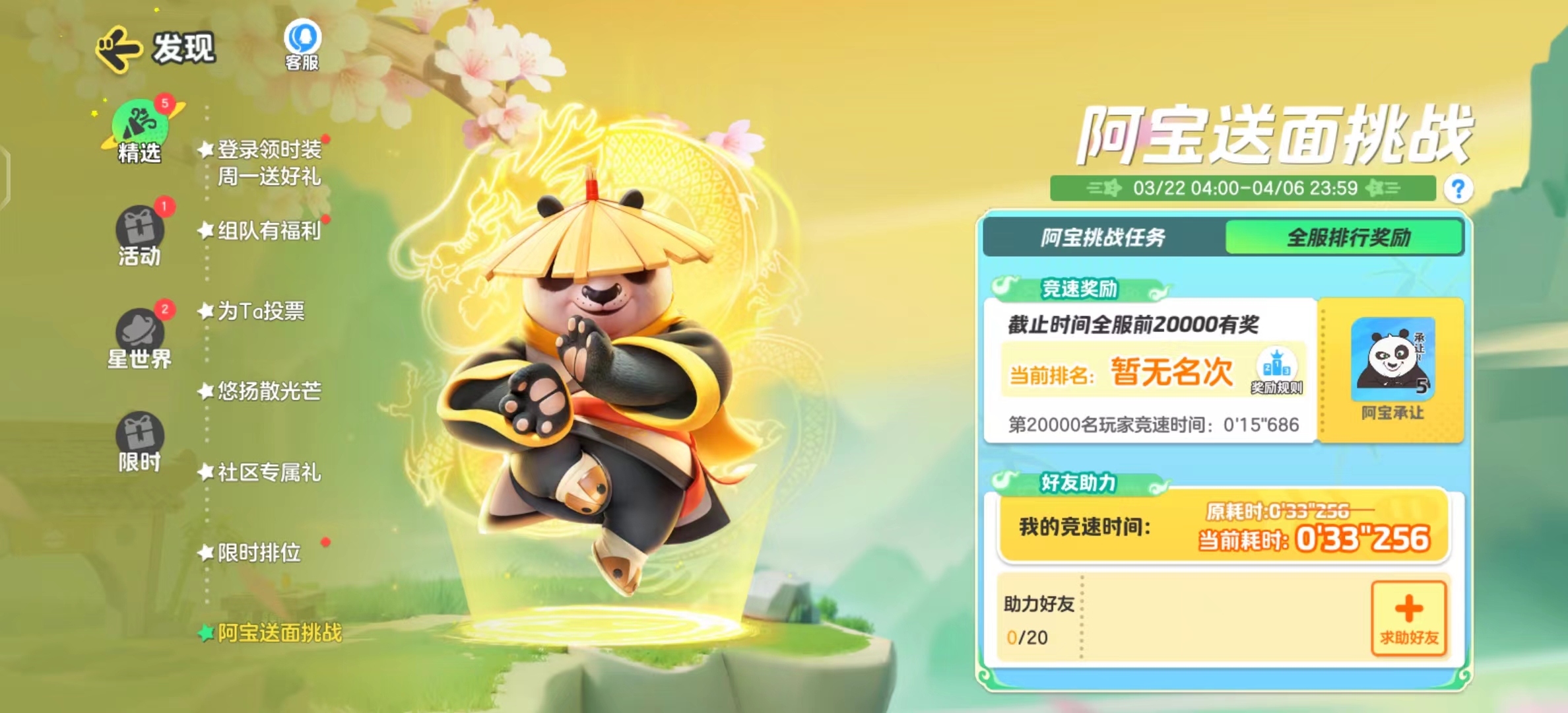 天下武功,唯快不破!通过梅花桩登上云端的速度也会被记录下来,星宝们可以在【全服排行奖励】里查看自己的最快挑战记录!如果送面的速度能够名列全服前20000,还能获得阿宝的【承让】表情奖励~