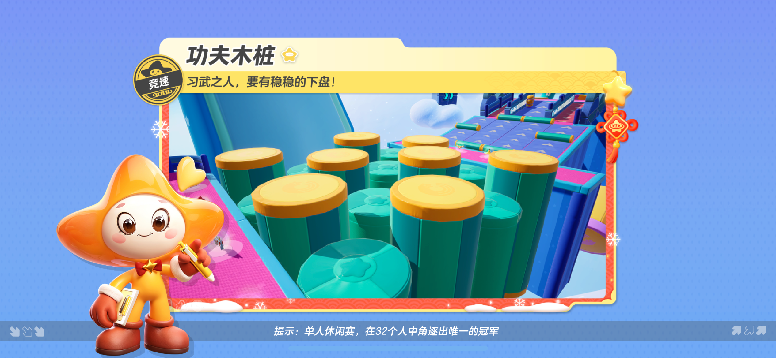 第一道障碍是滚动木桩和弹力糖葫芦!滚动木桩会推着星宝们向后倒退,被弹力糖葫芦撞到的星宝会被弹开哦~此时需要观察弹力糖葫芦左右移动的频率,多多使用跳跃技能前进~
