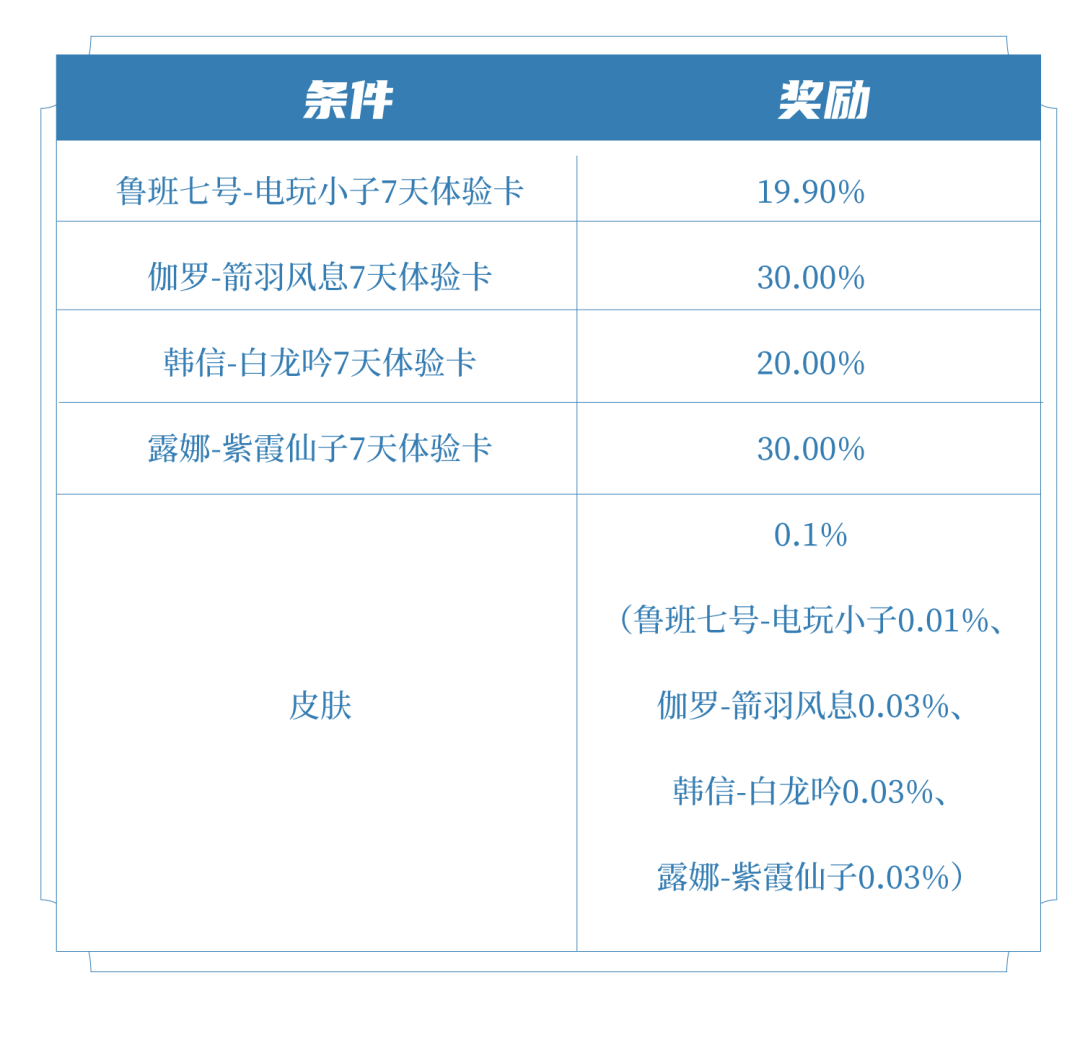 打开后必得皮肤碎片x2、铭文碎片x100和以下随机奖励之一:皮肤或皮肤体验卡(7日)1张、(鲁班七号-电玩小子、伽罗-箭羽风息、韩信-白龙吟、露娜-紫霞仙子)