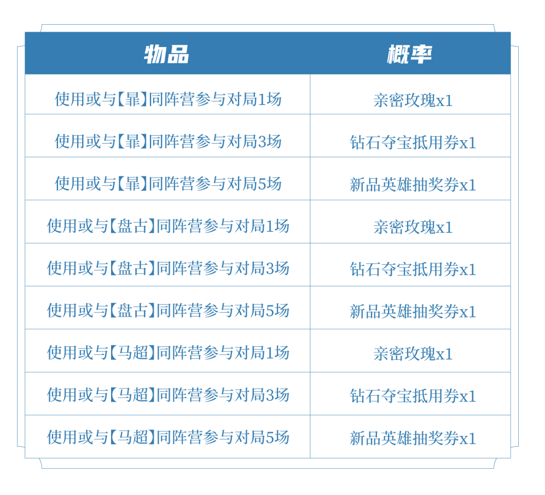 活动期间与指定英雄同阵营参与对局送亲密度道具等好礼!