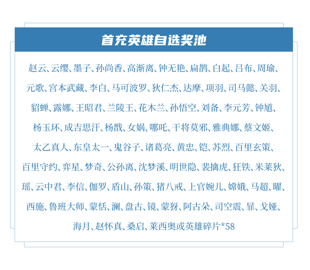 4. 新版首充中英雄自选奖池的可选英雄范围,未来将随版本迭代进行持续更新,详见后续公告