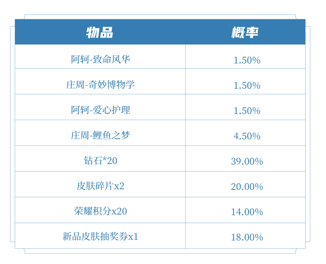 购买礼包必得红蓝对决(1日),可额外随机获得以下之一:阿轲-致命风华、庄周-奇妙博物学、阿轲-爱心护理、庄周-鲤鱼之梦、皮肤碎片x2、荣耀积分x20、新品皮肤抽奖券x1、钻石x20。累计100次必得阿轲-致命风华和庄周-奇妙博物学。