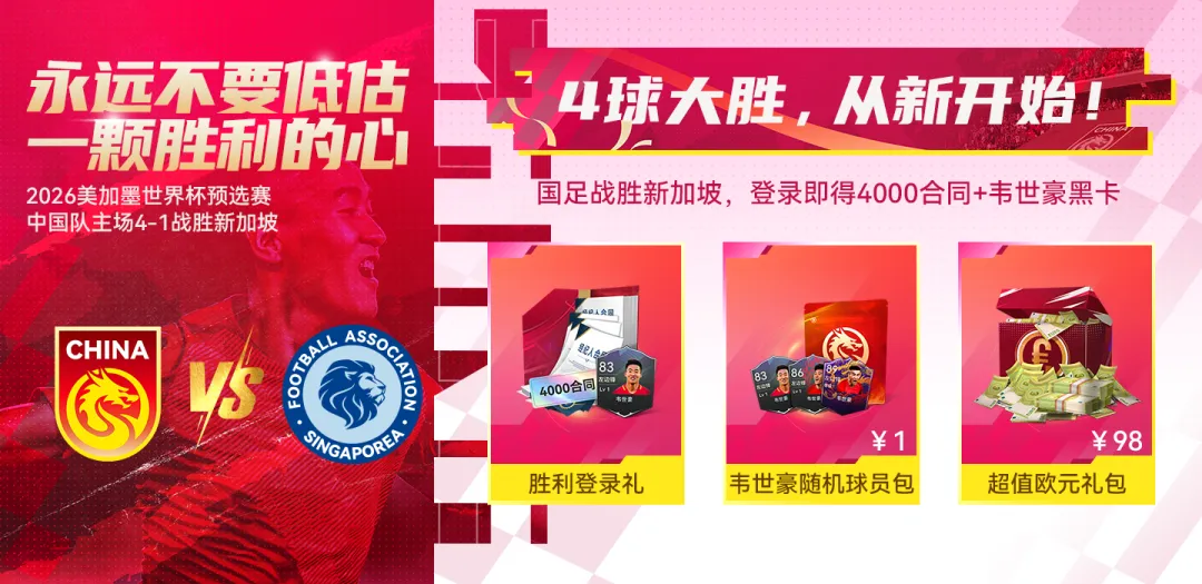 4球大胜,从新开始!活动期间,登录游戏即可领取40连抽、83韦世豪黑卡特别奖励!