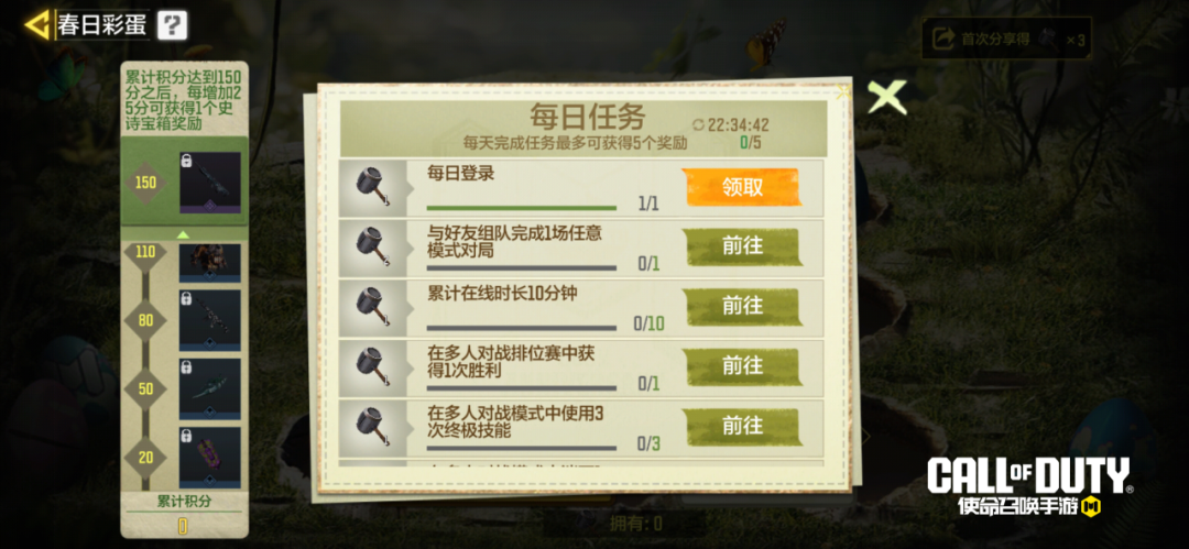 活动期间,战士们需要完成每日任务获取体力,每日最多可完成5个任务,每日0点刷新任务进度。得到体力之后,战士们就能参与砸彩蛋游戏啦。