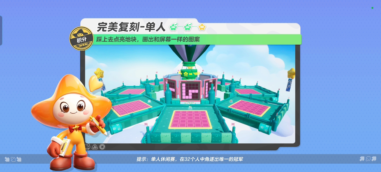 今天星妹给大家带来的【完美复刻】是一张个人积分地图,星宝们需要尽快点亮地块对屏幕上的图案进行复刻,四张图案都复刻完毕并且超越对手才可通关哦!