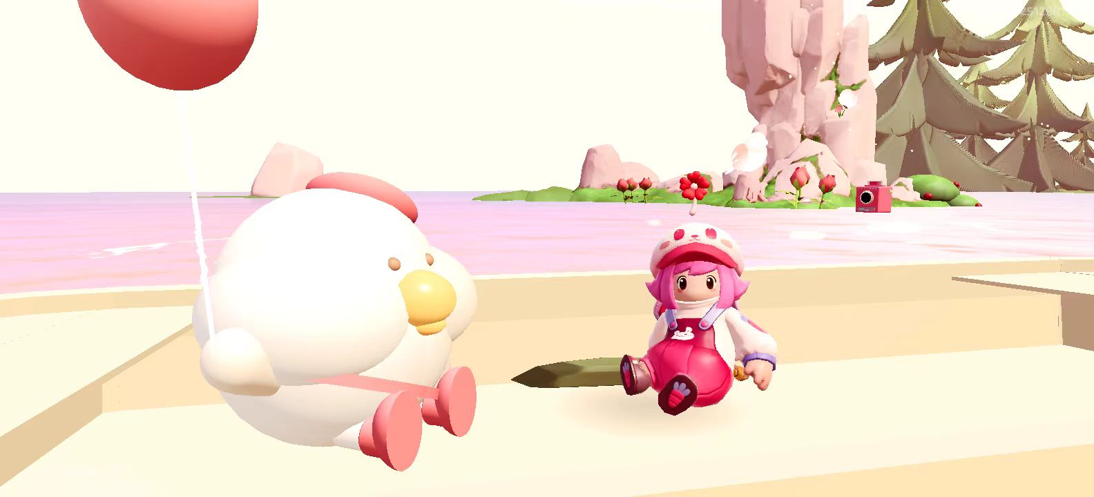 记录下美丽瞬间之后,继续前行吧~视角突变,顺着地图指引,星妹看到了由一大片粉色河流构成的区域。坐上粉色河流上Toby驾驶的小船,星妹当然要和她合影!