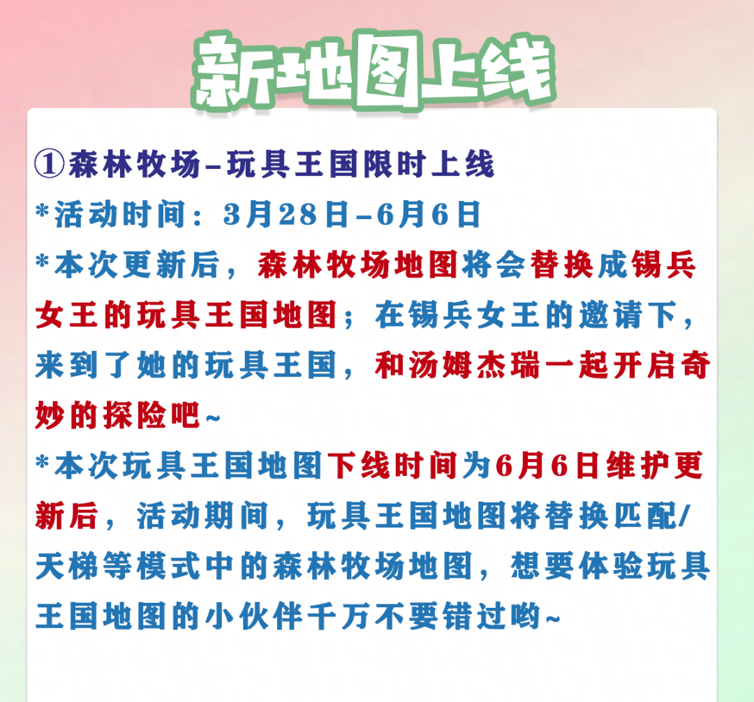 *本次玩具王国地图下线时间为6月6日维护更新后,活动期间,玩具王国地图将替换匹配/天梯等模式中的森林牧场地图,想要体验玩具王国地图的小伙伴千万不要错过哟~