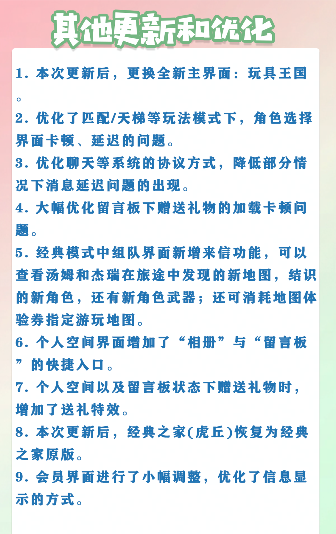 2. 优化了匹配/天梯等玩法模式下,角色选择界面卡顿、延迟的问题。