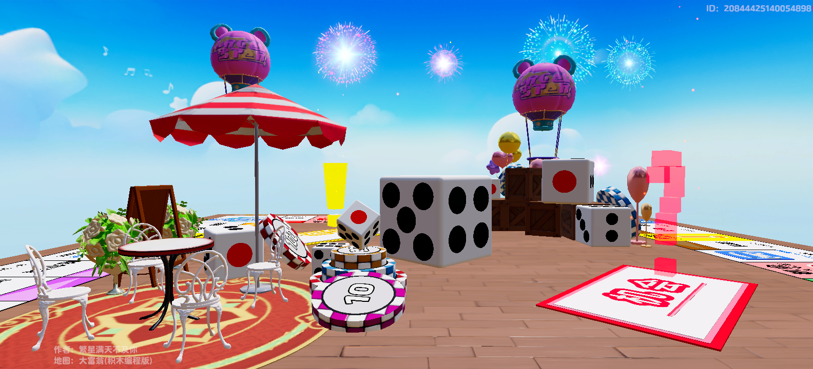 大骰子稳稳地摆在场地中央,旁边立着可爱的圆桌、座椅和遮阳伞,粉色的小熊热气球在空中漂浮,“机会”、“命运”卡牌上跳动着彩色的符号……