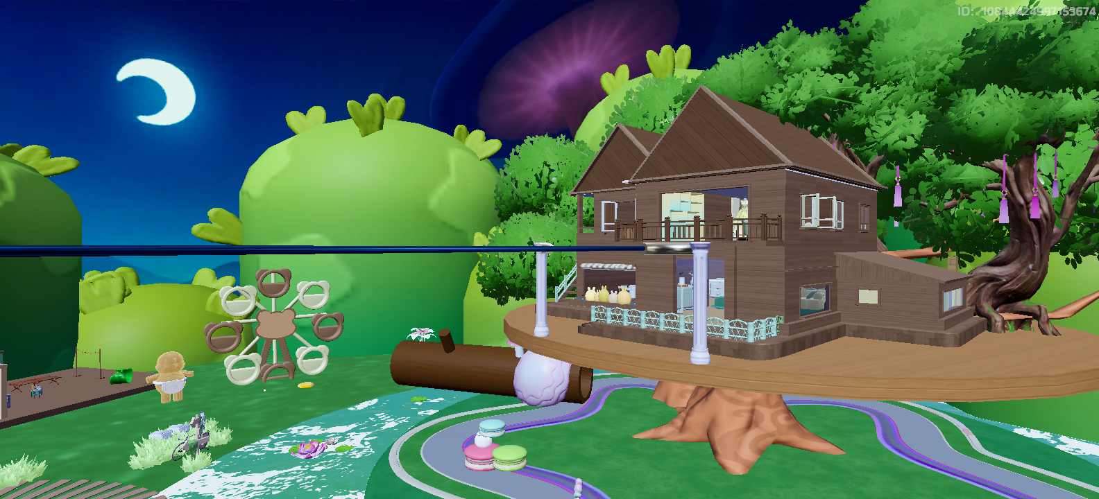 继续在丛林里漫步,月色下映入眼帘的是深蓝色天幕间的一片翠色。别墅式的大树屋搭建在木质平台上,流水里漂浮的莲花灯,想必也一定承载了很多星宝们的心愿叭~