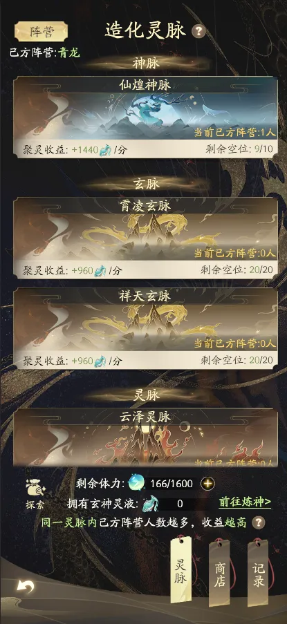 ①灵脉每天均会开启,灵脉共分为四个[神脉]、[玄脉]、[灵脉]、[幽脉],越高级的灵脉,聚灵时获取[玄神灵液]的收益就会越高,相对的聚灵位置也就越稀少。