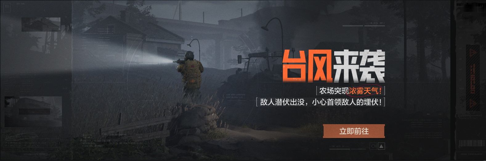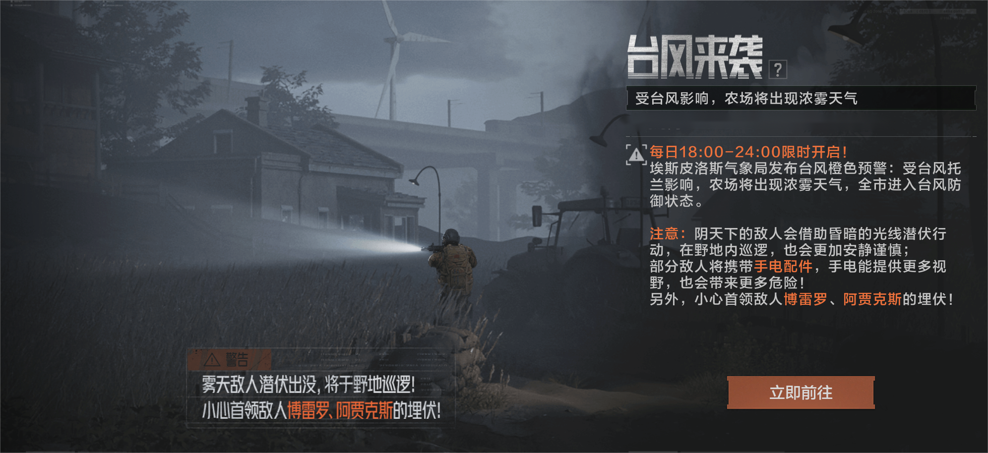 敌人将借助浓雾潜伏行动,在野地内巡逻;也会更加安静谨慎;部分敌人将携带战术手电配件,手电能提供更多视野,也会带来更多危险!首领博雷罗、阿贾克斯将可能同时现身雾天农场,注意首领的埋伏!