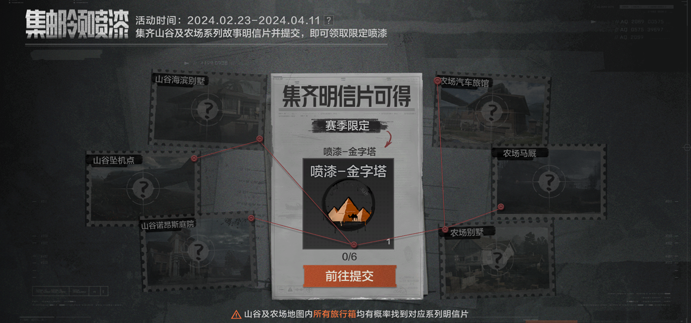 农场与山谷的明信片全部集齐后,先锋可前往活动界面提交6张明信片,领取限定喷漆【金字塔】。