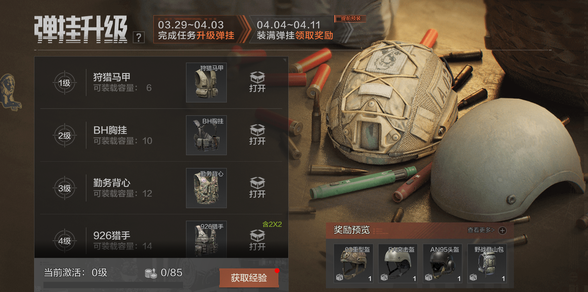 全新活动弹挂升级即将开启,完成活动指定获取弹挂经验,对应经验值将解锁对应档位的弹挂,先锋们可以在第二阶段领取弹挂内的物资奖励!开启弹挂奖励有机会获得03重型盔、FA突击盔等高级装备!