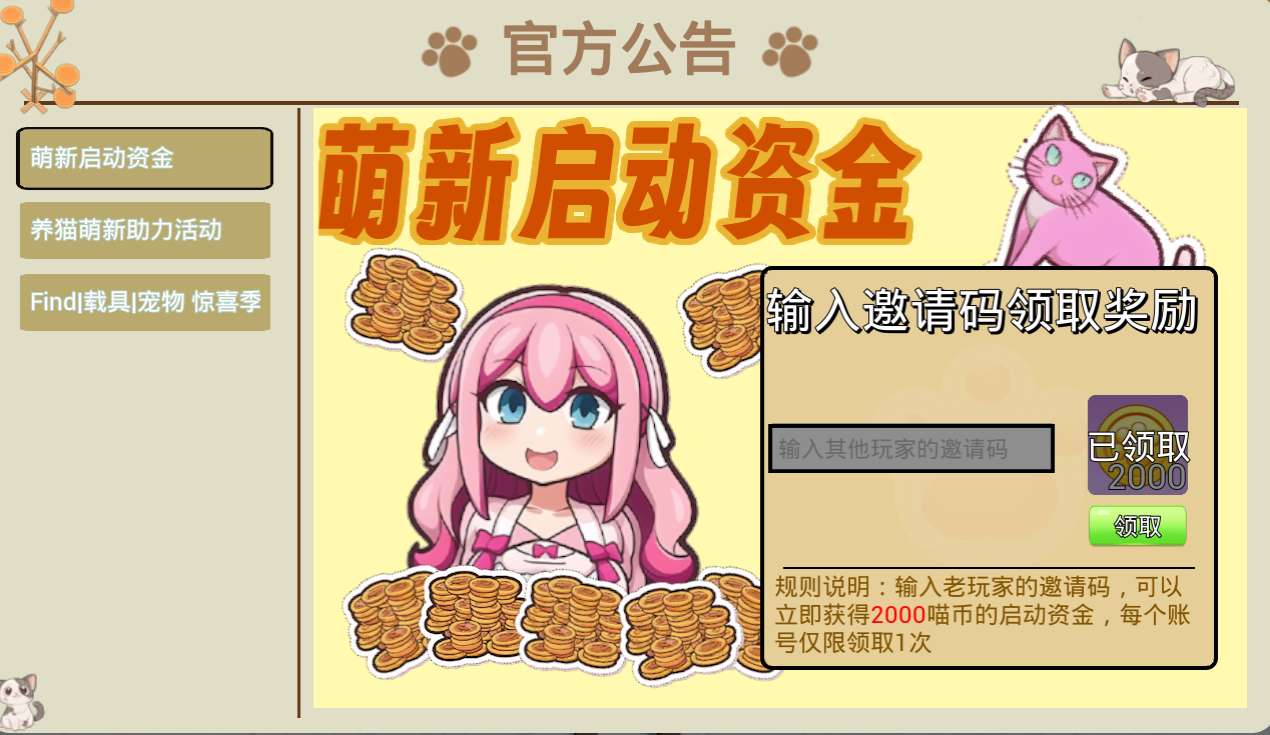 输入邀请码64405822可领取2000喵币不要错过!帮忙助力一下吧o(TヘTo)我真的很想要车车