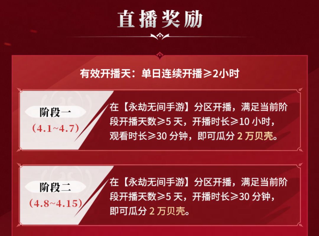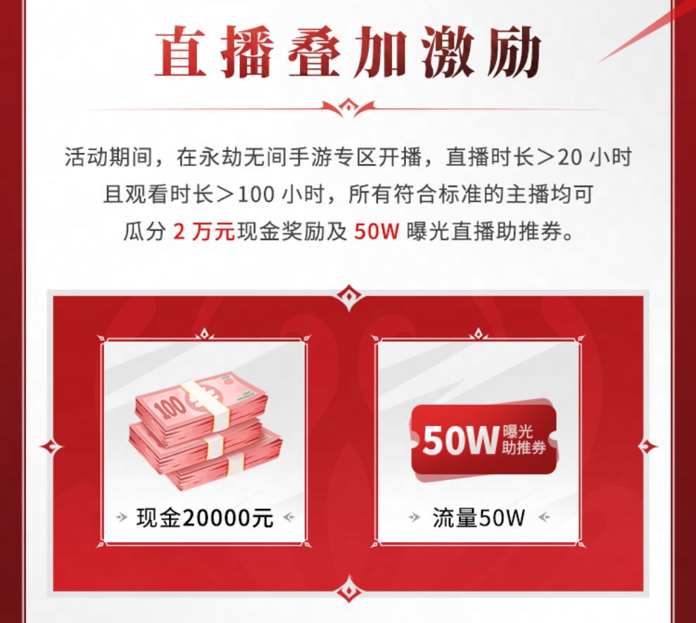 活动期间,粉丝≥1万的主播,在【永劫无间手游】专区进行相关游戏开播,根据用户观看时长进行排名,前 50 名即可获得奖励。