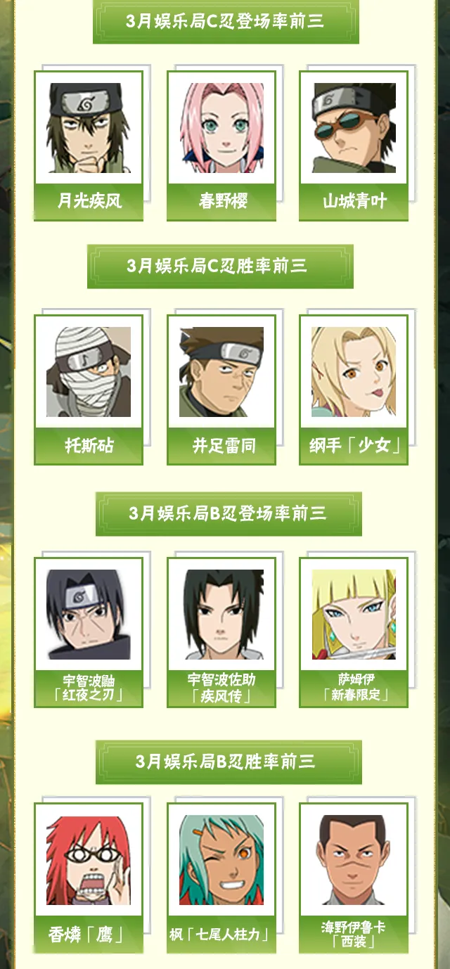 本期李姓分析就到这里啦~各位学员3月在决斗场使用率最高的是哪位忍者呢?快来【评论区】留下他的名字吧!