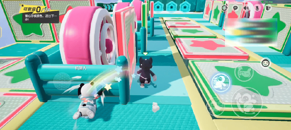 求稳的星宝更适合走两侧!竖直的挡路门前的蓝色地面是实心的,只要在通过变色星星墙时注意脚下,就没有其他安全隐患啦~
