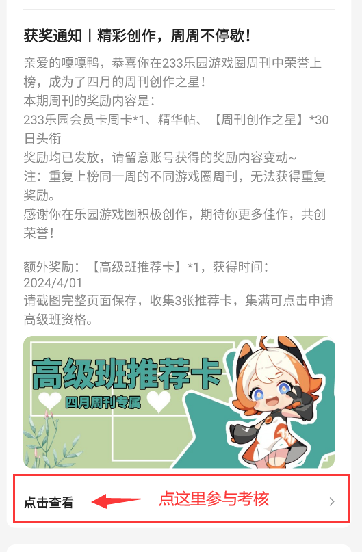 5、获得推荐卡的消息通知下方,点击可进入高级班资格考核。