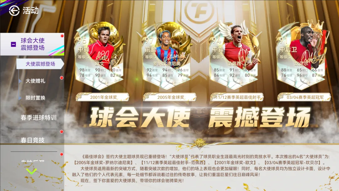 本次推出的4名“大使球员”为:【2005年金球奖-罗纳尔迪尼奥】、【11/12赛季英超最佳射手-范佩西】、【2001年金球奖-欧文】、【03/04赛季英超冠军-坎贝尔】。